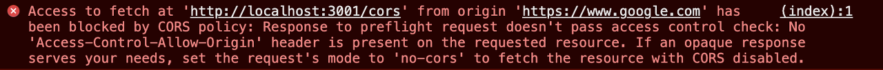 위의 CORS policy 오류 메시지는 CORS 정책을 위반할 때 발생한다.